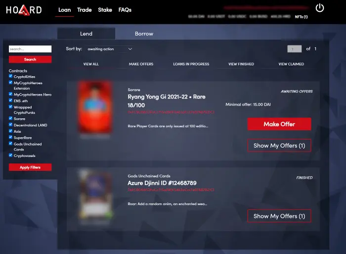Users can trade their own NFT’s by listing them or discover other NFTs to purchase. Once a user acquires an NFT or uploads his own NFT into the marketplace, he can use them as collateral for a loan, depending on supply and demand. Hoard’s solution offers lenders a tool to yield high profits and an opportunity to acquire desired NFTs in case of a foreclosure.