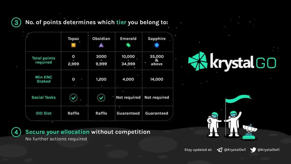 KrystalGO has participation tiers designed to cater to users of different portfolios. To qualify, users are allotted points in 2 categories – amount of staked Kyber Network Crystal (KNC) tokens at KrystalGO, and overall token swap trading volume on the Krystal platform.