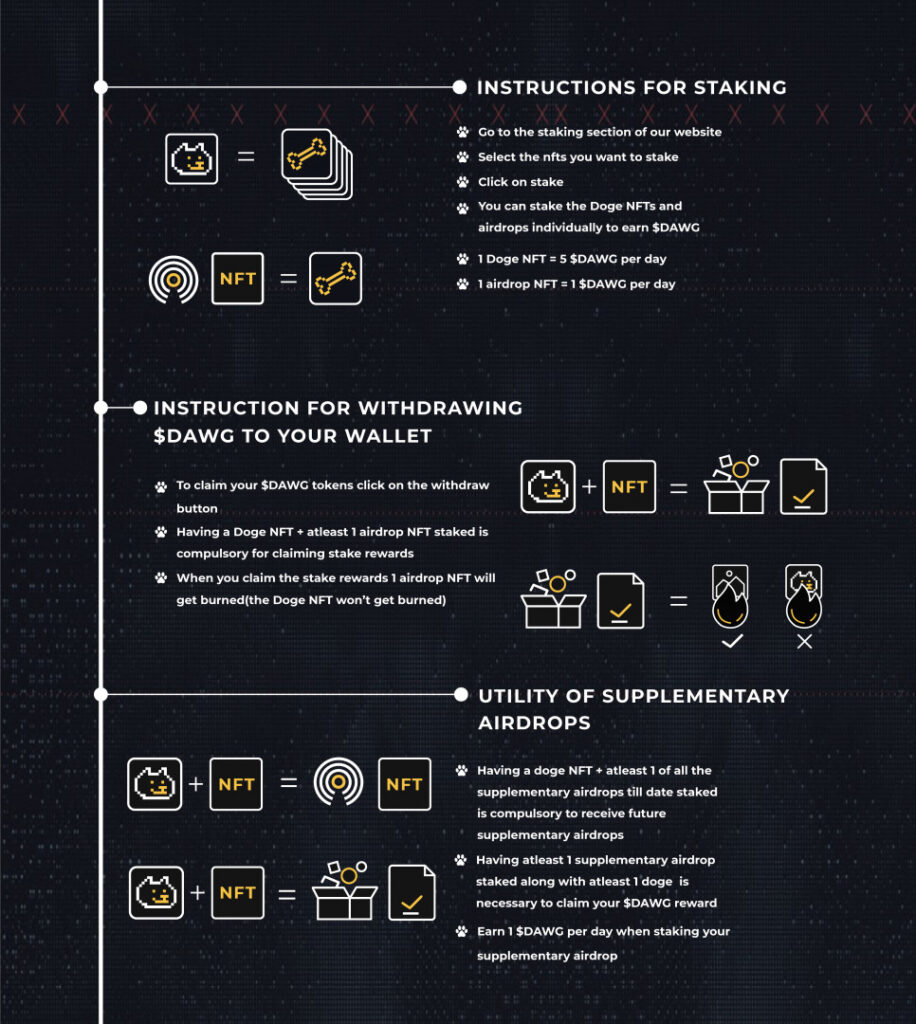 When staking is live, users can head over to the staking section on the Doge Capital website and decide which Doge NFT they would like to commit. 1 Doge NFT staked means 5 $DAWG token reward per day, while an airdropped NFT will mean 1 $DAWG per day.