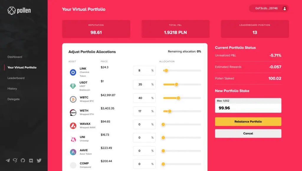 Pollen DeFi simplifies crypto portfolio management. It provides new opportunities to earn for both profitable traders and those wishing to hold dynamically managed portfolios, without the need for them to manage allocations and assets themselves.