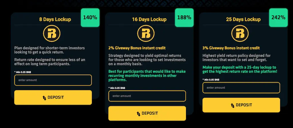 Minimum BNB Stake: 0.05 BNB Max unlimited