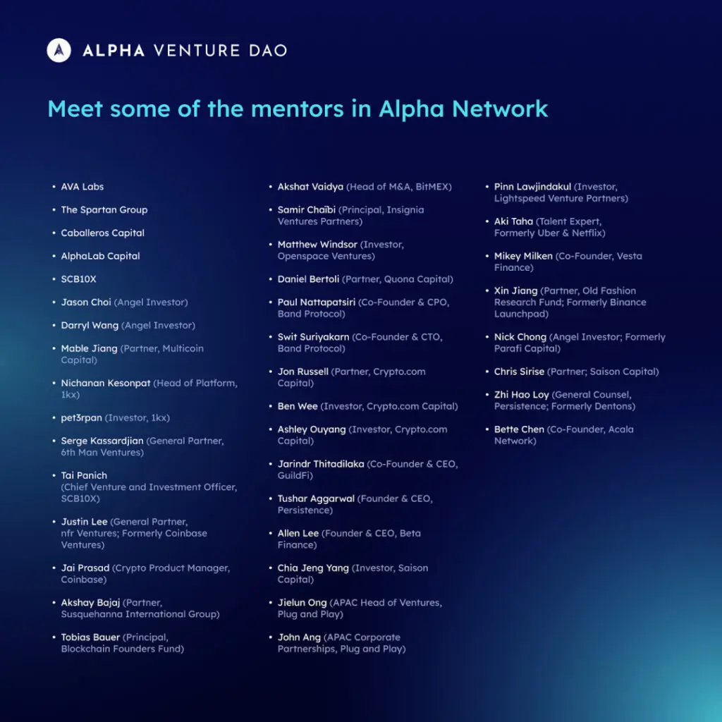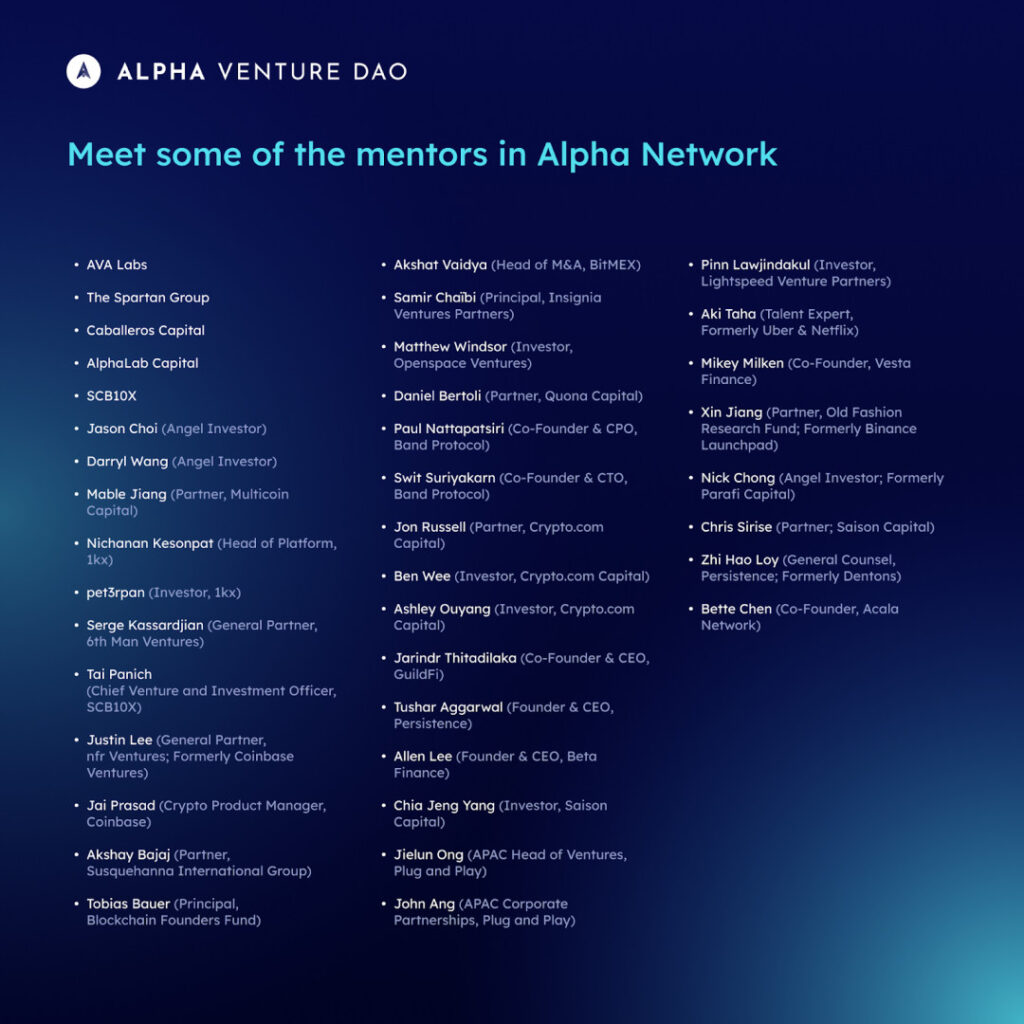 Alpha Venture DAO brings more than 50 thought leaders and top minds in Web3. Founders will get unique access to hands-on mentorship from Alpha Network, including AVA Labs, The Spartan Group, Multicoin Capital, SCB10X, AlphaLab Capital, Jason Choi, Darryl Wang, and individuals from Coinbase, Bitmex, Crypto.com Capital, SIG, 1kx, Band Protocol, Acala Network and many more. Incubated projects will also receive technical and infrastructure support from Terraform Labs.