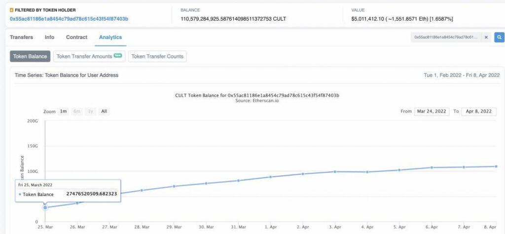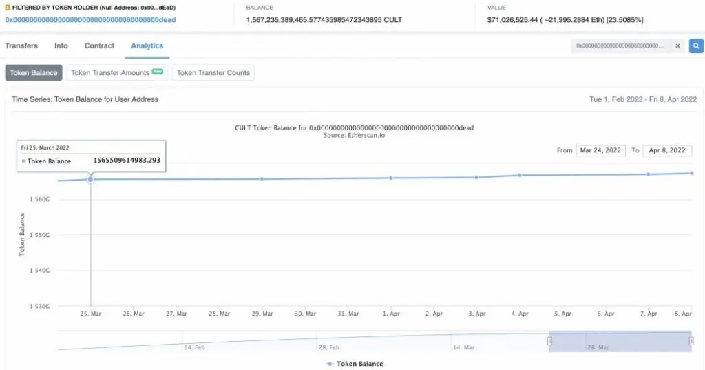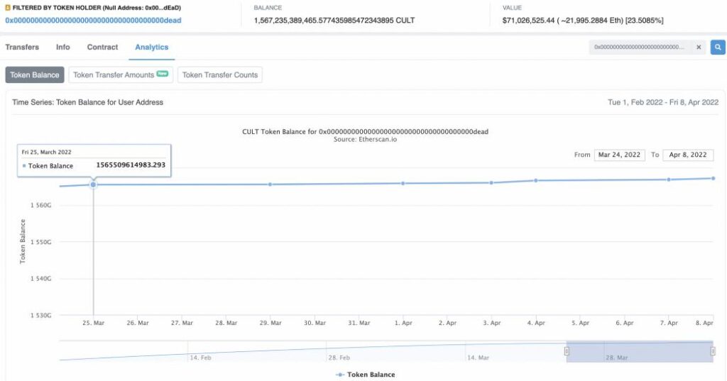 According to Etherscan data, the Cult DAO protocol burned over 1.725 billion CULT tokens in the past two weeks. More precisely, 1,725,774,482 CULT, which equals roughly 25ETH, was burned from March 24 to April 8, 2022.