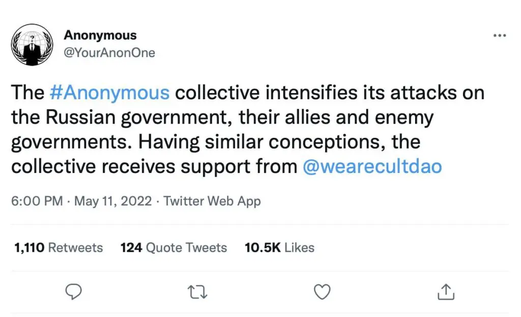FAnonymous, the international activist group responsible for white-hat hackings, announced that it intensifies its fight against Russia and other unjust national governments. To this end, it will source funds from crypto projects with “similar conceptions,” such as CultDAO.