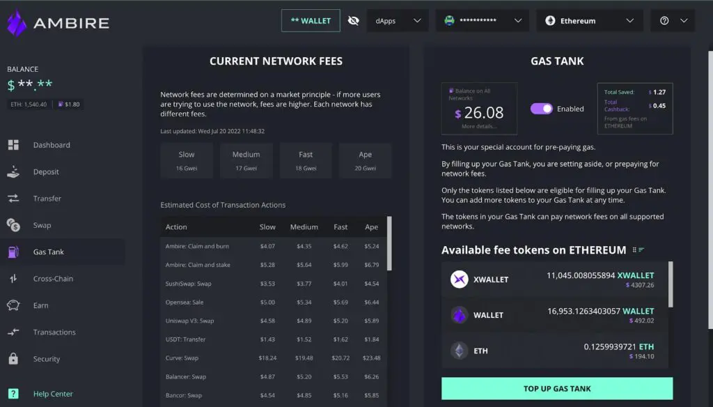 The Gas Tank uses the technology of Meta Transactions, which are transactions signed by one user but relayed (and thus paid for) by another. The transaction itself cannot be changed by the relayer. The Gas Tank supports many different tokens on multiple networks. When a user makes a deposit, they are thus prepaying the network fees they will eventually generate, with the relayer providing the actual ETH or other gas tokens for the transactions. Thus, the users will save on unnecessary gas fees for swapping and earn cashback from Ambire.