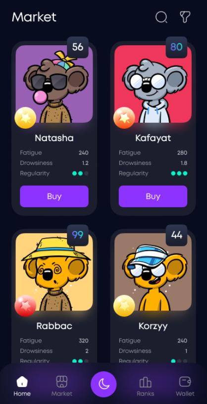 • Users can augment their earnings by leveling up their Sleepies or their profile itself. To level up a profile, a certain amount of Moons will be required which can be collected by completing daily tasks such as “walk 1000 steps”. Additionally, leveling up a Sleepie can increase its attributes. Each Sleepie has different attributes such as “Luck – chance of getting a mystery box after sleep”.