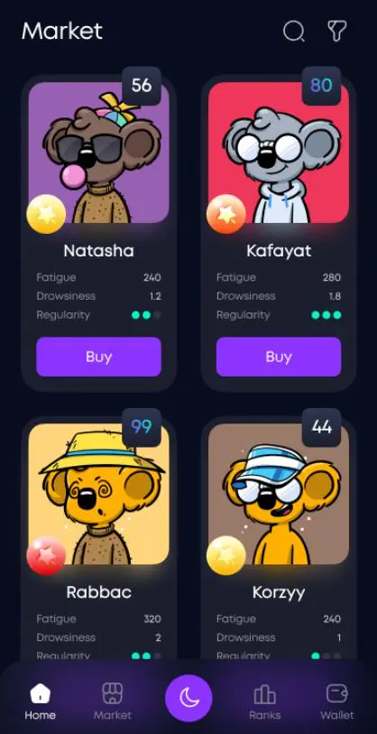 • Users can augment their earnings by leveling up their Sleepies or their profile itself. To level up a profile, a certain amount of Moons will be required which can be collected by completing daily tasks such as “walk 1000 steps”. Additionally, leveling up a Sleepie can increase its attributes. Each Sleepie has different attributes such as “Luck – chance of getting a mystery box after sleep”.