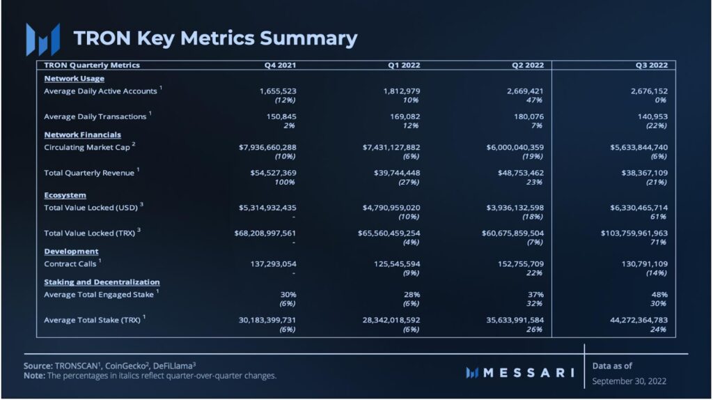 “The majority of Layer-1 blockchains and their respective ecosystems have experienced declines in the first half of 2022. For most, Total Value Locked (TVL) declined further in Q3 2022, due to a continuation in negative market sentiment and looming regulatory concerns. TRON, however, managed to insulate itself from adverse market conditions by growing its TVL by 61% QoQ.”