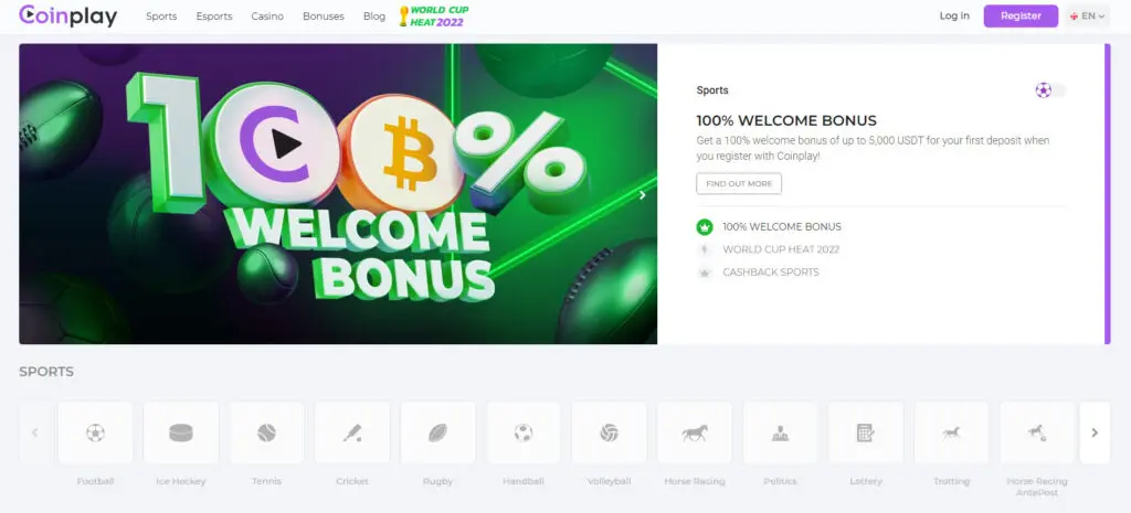 Coinplay has been launched in November 2022. It’s a new platform with many options to place a bet on sporting events and play slots or casino games. Coinplay welcomes new users with a 100% Welcome bonus of up to 5,000 USDT, which is a great chance to double players’ first deposit! One of the key features of Coinplay are their user-friendly modern interface, support for more than 40 crypto coins, fiat-crypto exchange via third-party widget, and thousands of options of what to bet on, or which game to play.
