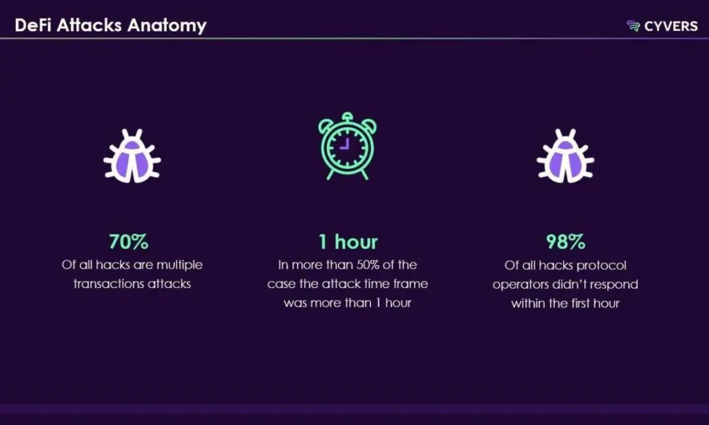 Auditing is a widespread practice, but smart contract vulnerabilities are still the main source of exploitation. The average attack usually takes more than one hour to complete and 98% of all hacked protocols didn’t respond within the first hour.