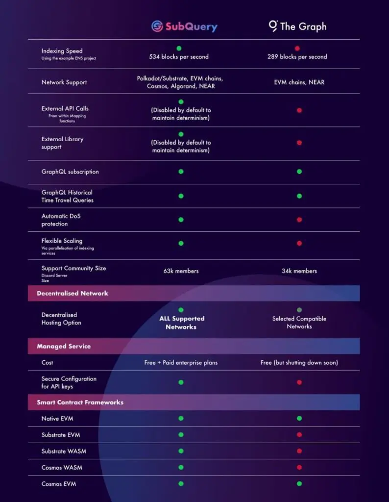 SubQuery also brings some major improvements to existing decentralised indexing solutions which include far more flexibility and better controls for developers to run projects in their own infrastructure, plus the ability to support enterprise level projects in its managed service which provides enterprise-level infrastructure hosting and handles hundreds of millions of requests each day and unlike The Graph, will not be sunsetted.