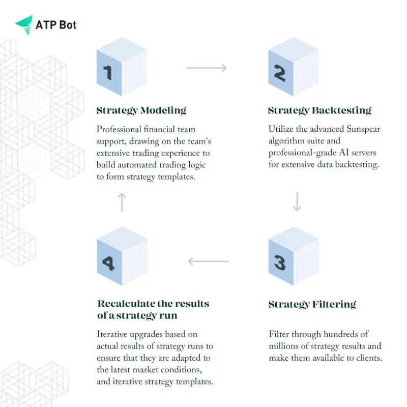 ATPBot makes use of Wiskeep’s fund strategy modelling support and draws upon its team’s extensive trading experience to establish automatic trading logic. It leverages the advanced Sunspear 2.0 algorithm suite to calculate super high-level parameters essential for optimal strategy performance.