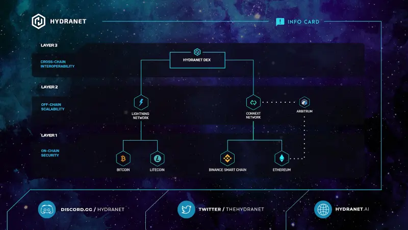 Hydranet presents their DEX as a Layer 3 trading platform that connects the Bitcoin and Ethereum ecosystems (including all off-chain compatible Ethereum Virtual Machine (EVM) networks), allowing users to trade seamlessly between them. By their use of off-chain protocols, such as the Lightning and Connext Vector technologies, crafted into a single solution that allows these protocols to interact, Hydranet has made it possible to trade between fundamentally different blockchains with virtually no fees, near-instantly, and, most importantly, in a trustless manner, as users will always retain full control of their funds.