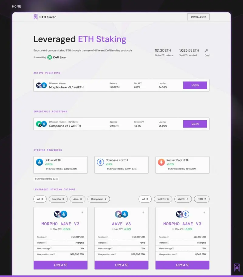 ETH Saver is a new non-custodial application that provides simplified access to various leveraged staking strategies. The app builds on top of existing DeFi Saver architecture and utilizes liquid staking tokens such as wstETH (Lido), rETH (Rocketpool), and cbETH (Coinbase), as well as multiple lending protocols, including Compound, Aave, and Morpho.