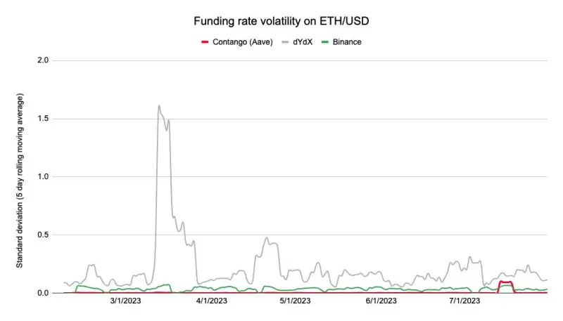 Aave has another key benefit for Contango: cPerps funding rates are determined by Aave’s lending and borrowing rates, and these are notoriously less volatile than funding fees of derivative exchanges. An internal study by the Contango team (see below) confirms that over the past 8 months these rates have been less volatile than Binance, the largest centralized exchange, and dYdX, the leading decentralized derivatives protocol (source).