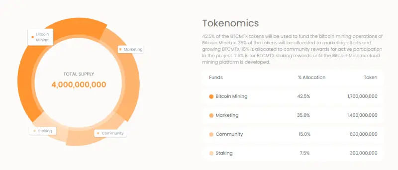 The Bitcoin Minetrix whitepaper states that there is a total supply of 4 billion BTCMTX tokens, with 70% of those (2.8 billion) available to buy during a 10-stage ICO.