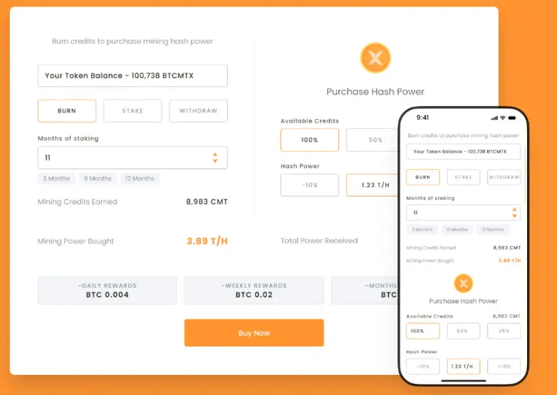 By staking BTCMTX, holders will not only earn staking APY but the tokens are converted into cloud mining credits, which are then burnt to generate allocated cloud mining time.