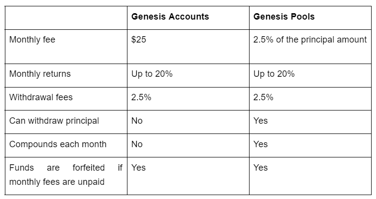 Genesis pools charge a monthly management fee (2.5% of the principal balance) and withdrawal fees. Users have the flexibility to withdraw their principal with Genesis pools.