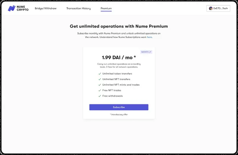 Nume users can conduct token and NFT transfers, NFT mints, NFT trades, and network deposits and withdrawals. A later update will see the rollup receive full EVM compatibility. Nume is also the first scaling solution to provide network subscriptions. Users can unlock all operations on the network at the introductory pricing of just 1.99 DAI a month.