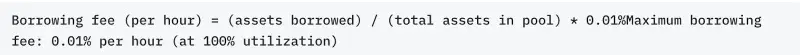 - Dynamic Borrowing Fee: This fee is calculated as (assets borrowed) / (total assets in the pool) * 0.01%, with a cap of 0.01% per hour at full pool utilization. This fee structure is for managing the liquidity and risk associated with leveraged trading.