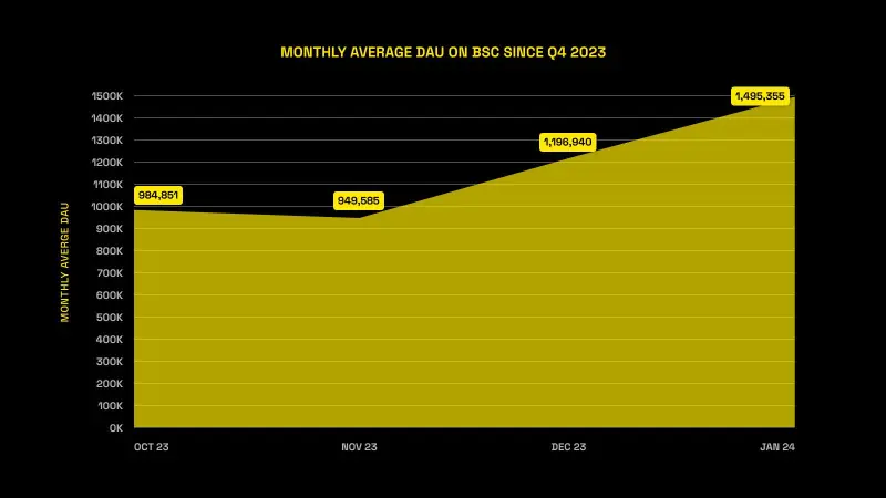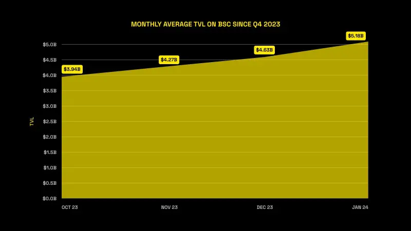 Strong performance coupled with continued launchpool activity from DeFi projects also led to a notable TVL increase on BSC. Monthly average TVL on BSC grew by more than 25% between October of 2023 and January of 2024, rising from $3.94B to $5.1B.