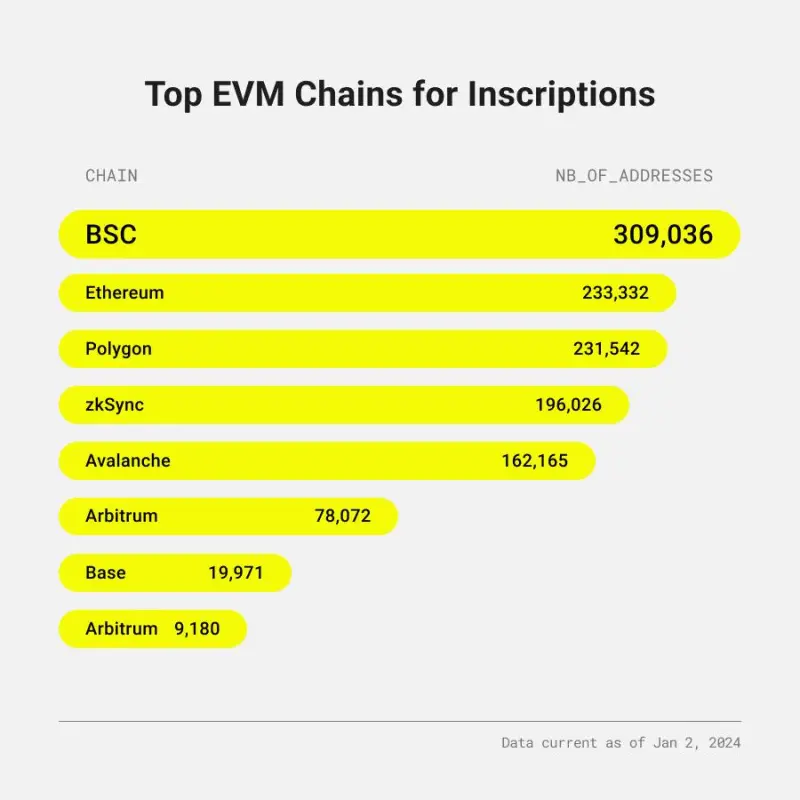 Also contributing to the surge is the fact that BSC has been leading as the number one EVM chain for inscription mint addresses. BSC is an ideal venue for inscriptions due to its high throughput and scalability, low gas fees, and rapid transaction finality that allows transactions to be confirmed within approximately 7 seconds.