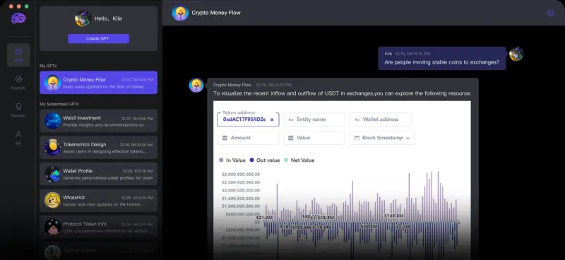 Each GPT seamlessly incorporates domain knowledge on cryptocurrencies, DeFi, NFTs, regulations, and more context to interpret user questions and historical data. Advanced handling of blockchain activity records, price chart trends, money flow, trading patterns, wallet activities, wallet holdings, wallet balance, social metrics, market sentiment, macro conditions, and other signals ensure well-rounded perspectives.