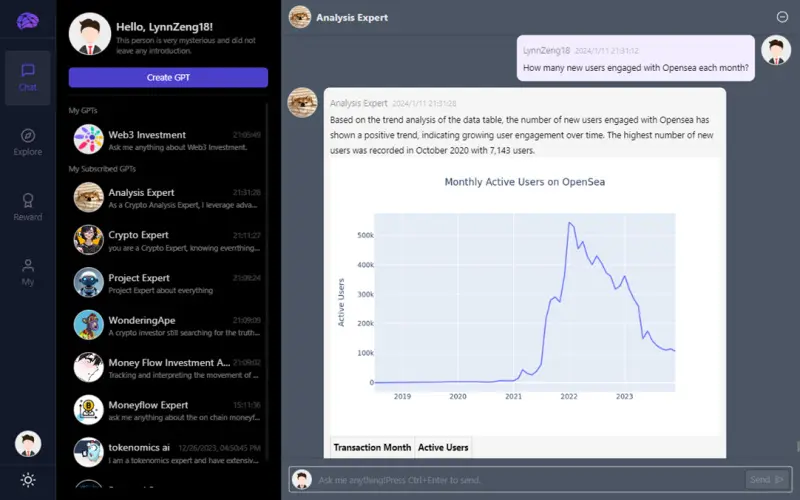 Each GPT seamlessly incorporates domain knowledge on cryptocurrencies, DeFi, NFTs, regulations, and more context to interpret user questions and historical data. Advanced handling of blockchain activity records, price chart trends, money flow, trading patterns, wallet activities, wallet holdings, wallet balance, social metrics, market sentiment, macro conditions, and other signals ensure well-rounded perspectives.