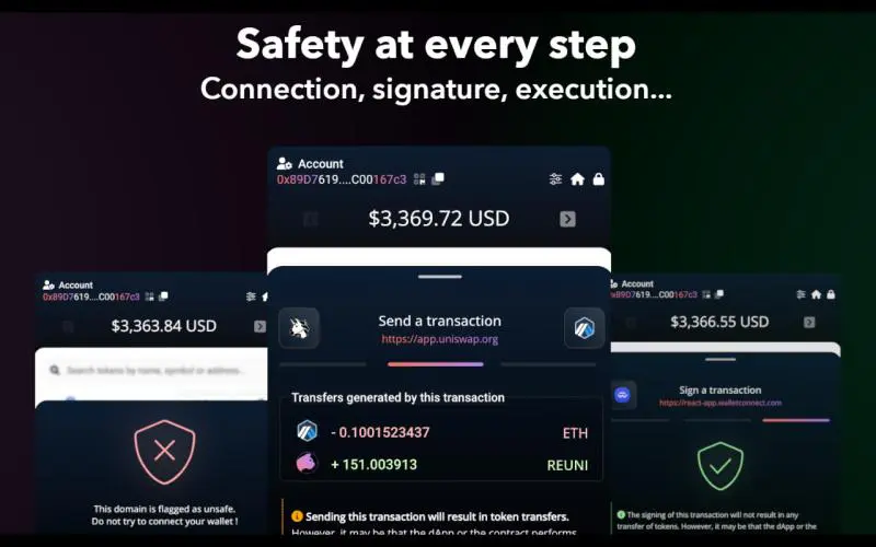 Security is a paramount priority for Reunit Wallet, which is why the wallet conducts a comprehensive simulation of each transaction and signature, allowing the user to anticipate the outcomes of their transaction, including token transfer confirmations or the granting of necessary permissions.