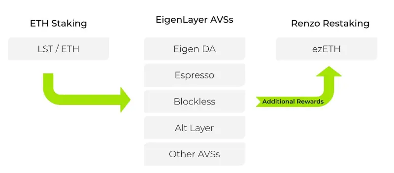 Renzo is the first native restaking protocol to launch on the EigenLayer mainnet. Although EigenLayer will not begin securing Actively Validated Services (AVSs) I.e. EigenDA until mid-2024, they have been accepting deposits. Deposits for Liquid Staking Tokens (LSTs) are capped; however, native ETH deposits remain uncapped but very difficult for most users to access. They require a user to have 32 ETH and run an Ethereum node that is integrated with EigenLayer to run EigenPods.