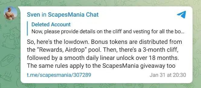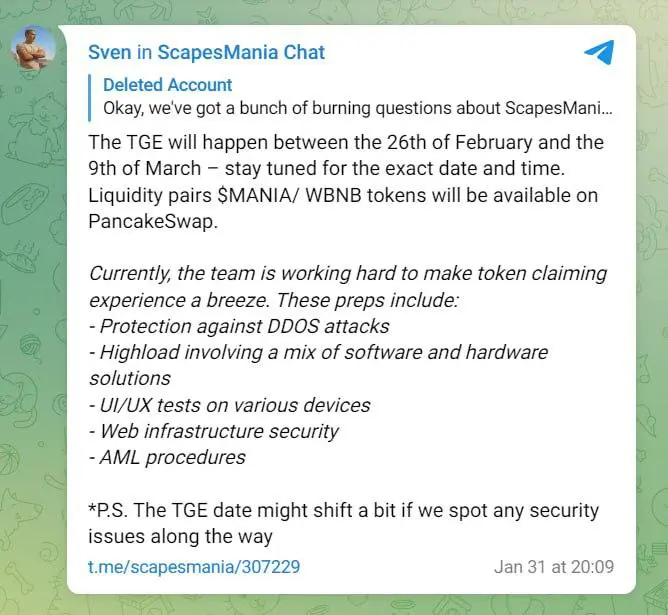 In an insightful AMA session, ScapesMania’s CEO revealed details about the upcoming TGE scheduled on PancakeSwap from February 26th to March 9th. Once it happens, the token will become available for purchase without a mandatory pre-sale vesting period.