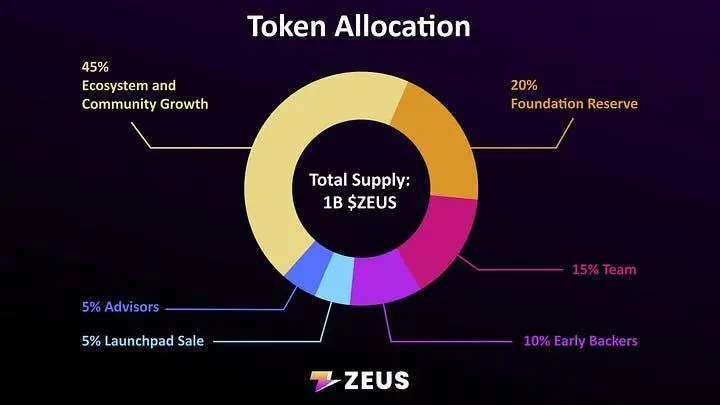 Zeus Network outlines a balanced token allocation strategy, ensuring equitable distribution among early backers, the foundation reserve, the team, advisors, and launchpad participants. This approach facilitates sustained ecosystem growth and community engagement.