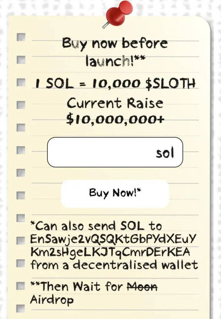 $SLOTH will then be dropped to all wallets sending $SOL following the token’s launch.