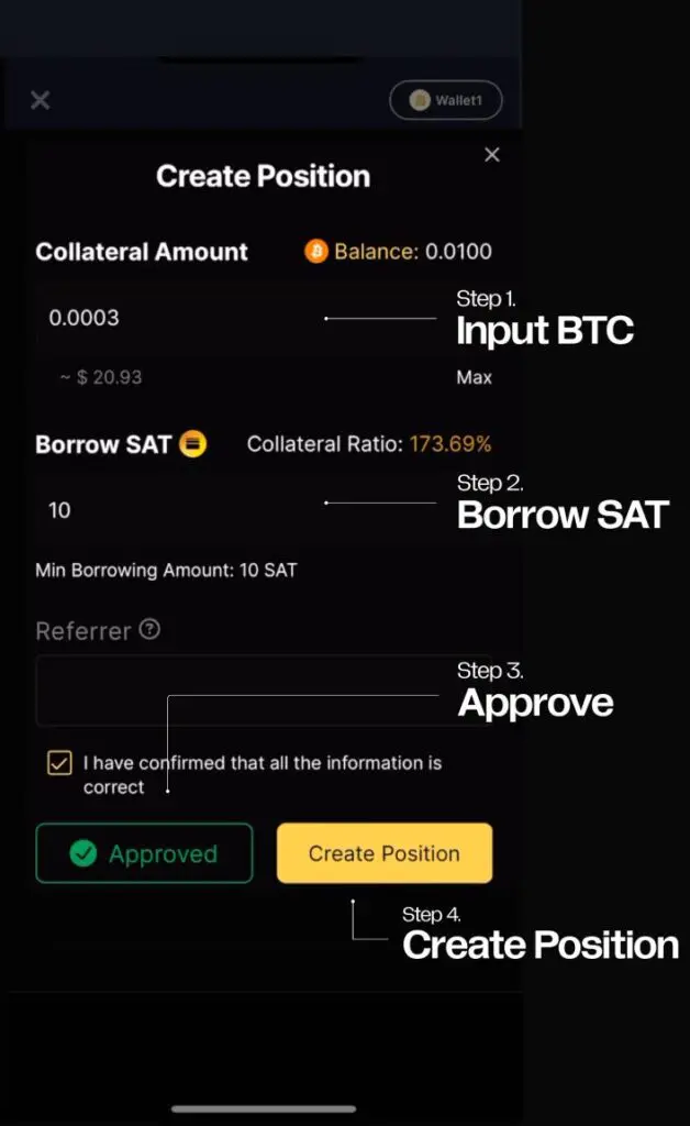 - Create positions on Satoshi Protocol ( at least 10 SAT )