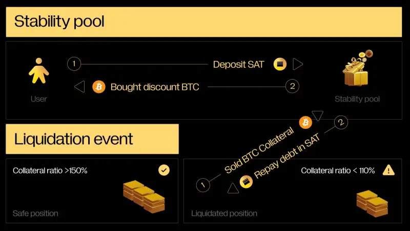 A liquidation is triggered if a user’s collateral value dips below 110% (MCR) due to price fluctuations. The user’s BTC collateral is sold at a discount to Stability Pool providers to repay the SAT loan. This mechanism protects the protocol and prevents borrowers from taking on excessive debt.