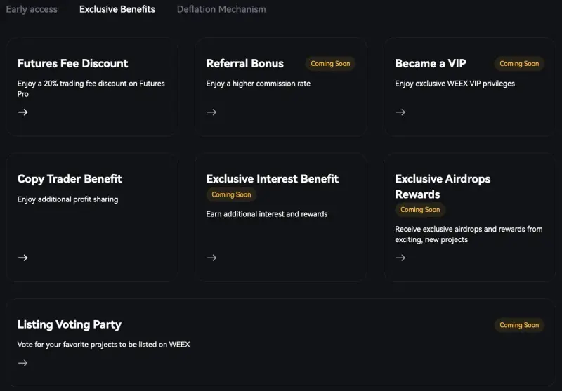 – Exclusive Holder Benefits: These include discounts on trading fees on the WEEX platform, higher commission rebates, VIP privileges for holding certain amounts of WXT, greater profit-sharing ratios for lead traders, earning interest on held WEEX WXT, exclusive airdrops from marquee projects, and voting rights in coin listings.