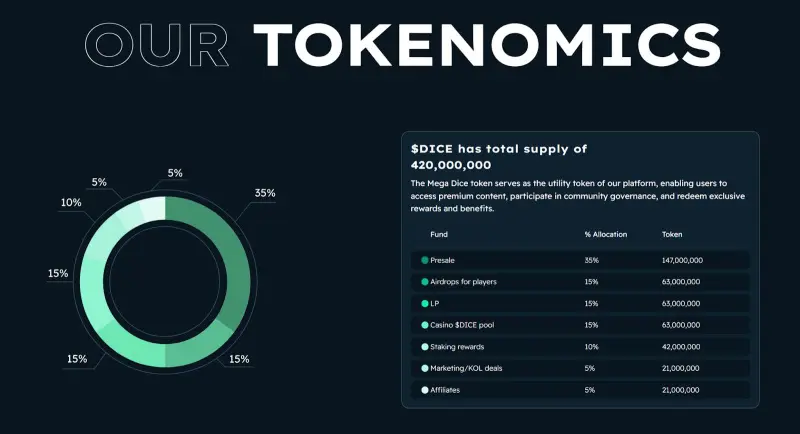 When it comes to the project’s tokenomics, it’s worth noting that an allocation of 147 million DICE has been set aside for presale buyers – representing 35% of the total supply. A further 63 million DICE, accounting for 15% of the supply, will be deployed to provide liquidity once the token is listed on a DEX.