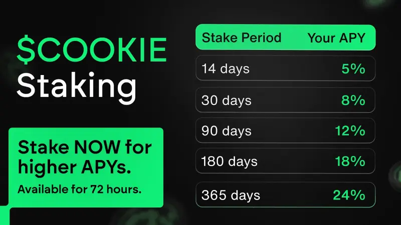 - Staking is another utility of the $COOKIE token. Cookie DAO aims to provide favorable APY rates for all $COOKIE stakers. At the same time, users who stake their tokens within 72 hours after listing can benefit from a boost of up to 24% APY for the entire staking period.