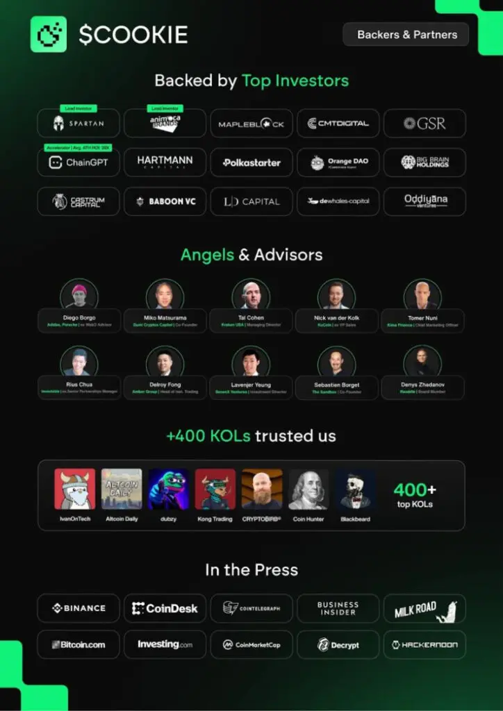 Before the listing, the Cookie DAO has built a solid list of VCs, backers, individual investors, creators, and advisors supporting the project from an early stage. The project has secured over 6M in funding from top Web3 VCs such as Animoca Brands or Spartan Group, key opinion leaders like Ivan on Tech or Altcoin Daily, and onboarding experienced advisors, including Diego Borgo or Sebastien Borget, Sandbox’s co-founder.
