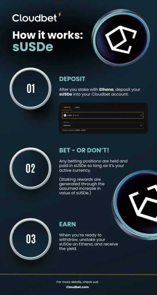 Cloudbet, a leading cryptocurrency casino and sportsbook, announced the integration of Ethena USDe (sUSDe) and ENA. By integrating sUSDe on the platform, bettors have now the chance to receive returns even when their funds are not being wagered.