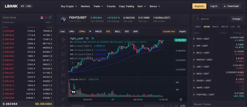 According to LBank data, the weekend market experienced a significant rebound following the Trump shooting incident, with the meme token FIGHT soaring to unprecedented heights. As of the time of writing, FIGHT is priced at $0.082464, reflecting a 24-hour increase of 519.64%.