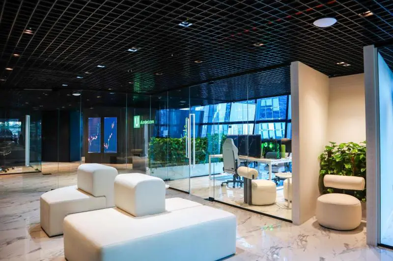 The headquarters are designed to resemble a lab-like environment that merges with a sleek, high-tech aesthetic. Flashing green and red strobe lights throughout the ceiling remind of the dynamic nature of the stock market, infusing the space with an air of financial futurism.