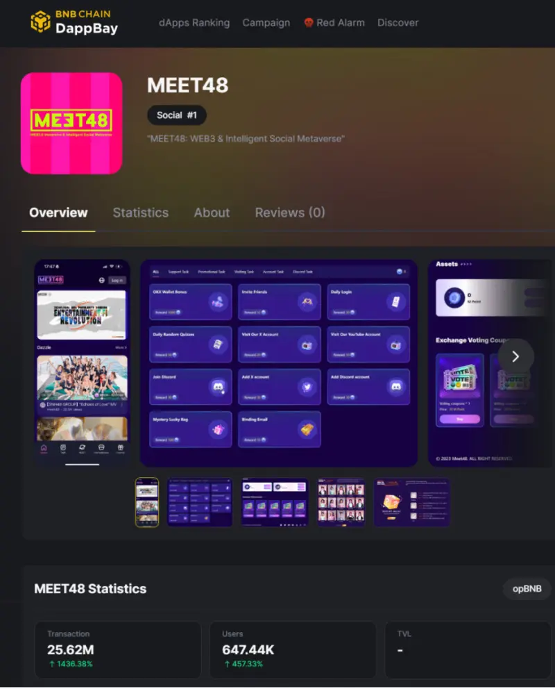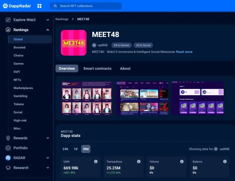 As of 12PM on July 26, 2024, the MEET48 event Dapp has become the number one social category Dapp on DappBay and ranked fifth in the social category on DappRadar.