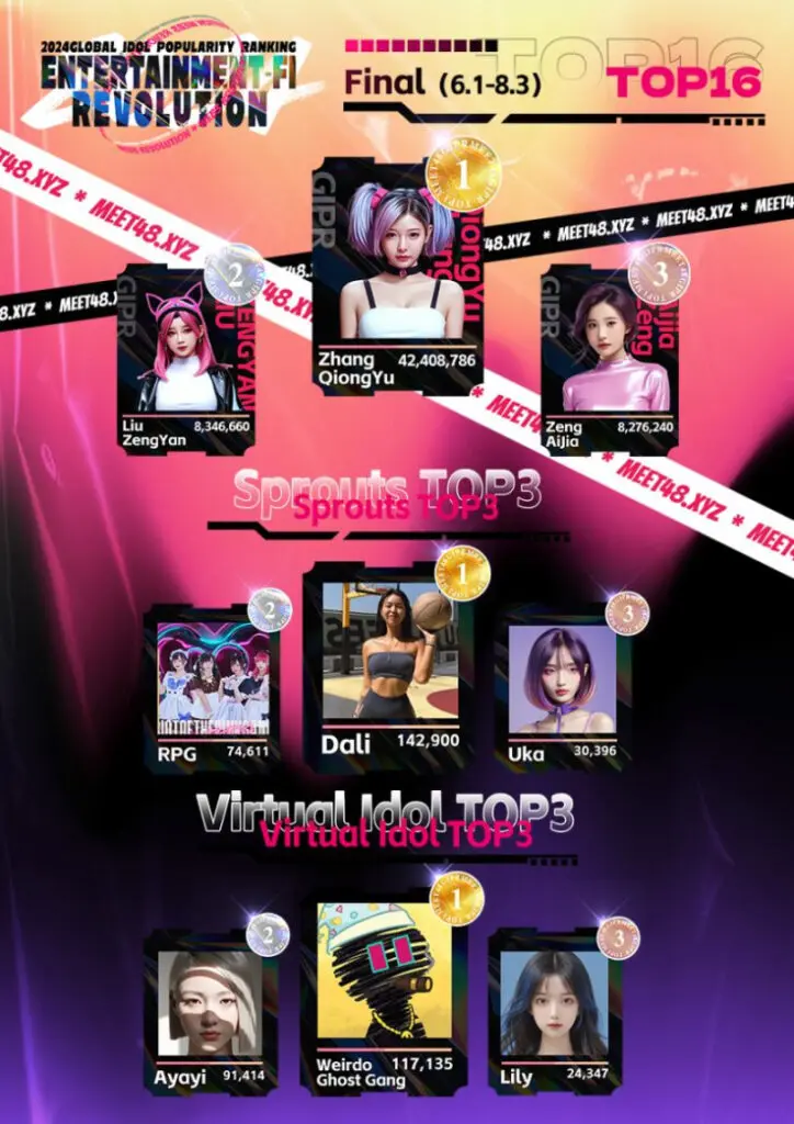 On August 3rd, the “2024 GIPR2” voting event, hosted by the metaverse virtual community MEET48, which is based on an AI and WEB3.0 diverse UGC entertainment content ecosystem, officially concluded. The top participants in the Idol Group, Sprout Group, and Virtual Idol Group were announced, along with their promotion plans for multiple overseas large-scale Web3 events organized or co-hosted by MEET48. The on-chain data of the MEET48 voting event Dapp and its rankings on DappBay and DappRadar have garnered significant attention.