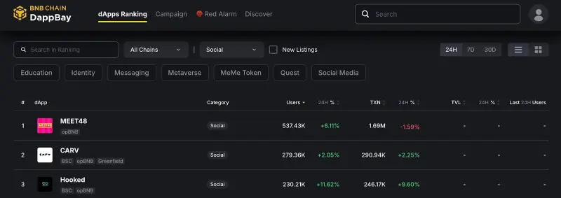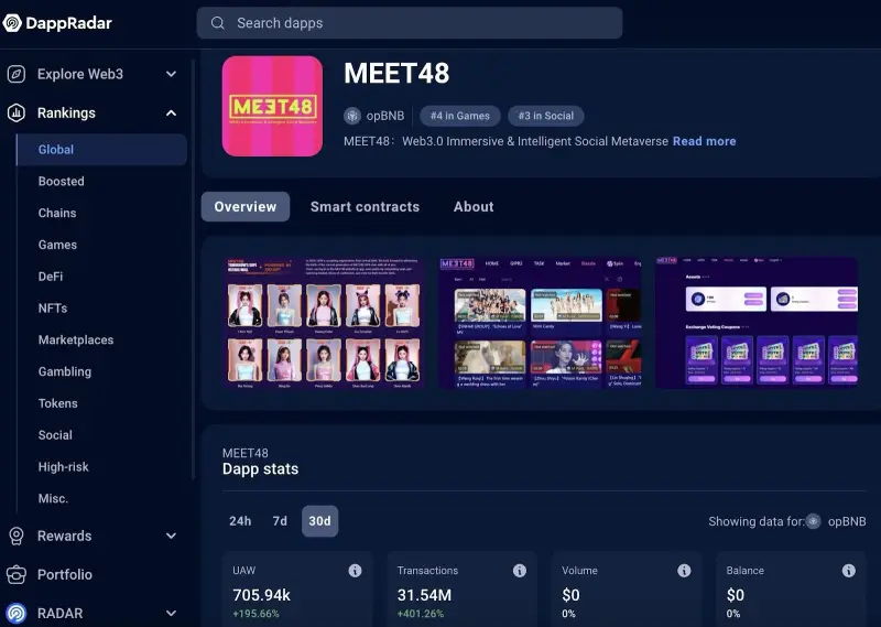As of August 3rd, the MEET48 event Dapp ranked first in the social category on DappBay and third in the social category on DappRadar. According to DappRadar, the MEET48 event Dapp achieved 31.54 million on-chain transactions and 705.94K UAW in the past 30 days. Similarly, DappBay reported that the MEET48 event Dapp achieved 32.61 million on-chain transactions and 701.68K UAW in the past 30 days.