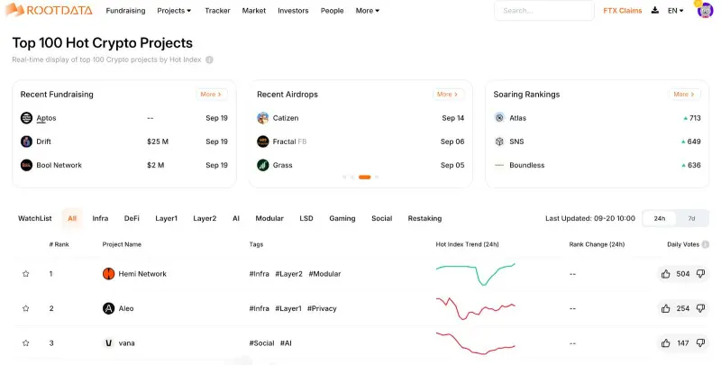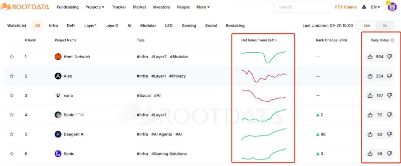 The ranking presents real-time investment sentiment changes through “Hot Index Trend (24h),” “Soaring Rankings,” and “Daily Votes” sections, helping users identify potential opportunities ahead of the curve.