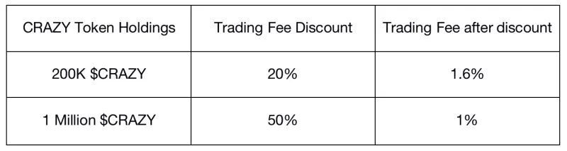 Holders of CRAZY tokens can enjoy trading fee discounts on the platform, with reductions ranging from 20% to 50%, depending on the amount of CRAZY held.