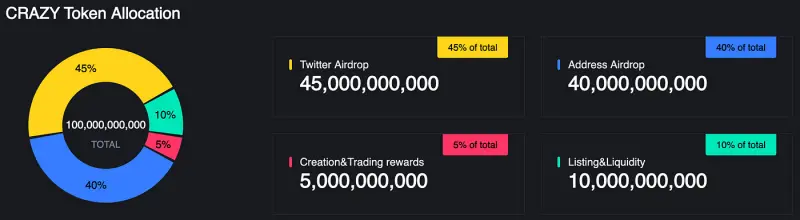 - 5% (5B) – Creation & Trading Airdrop: Users can earn CRAZY tokens based on their trading activity and participation in token creation.