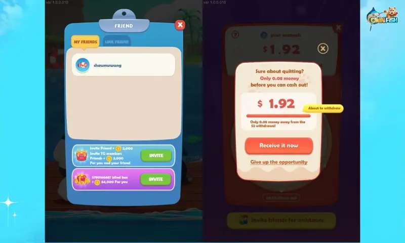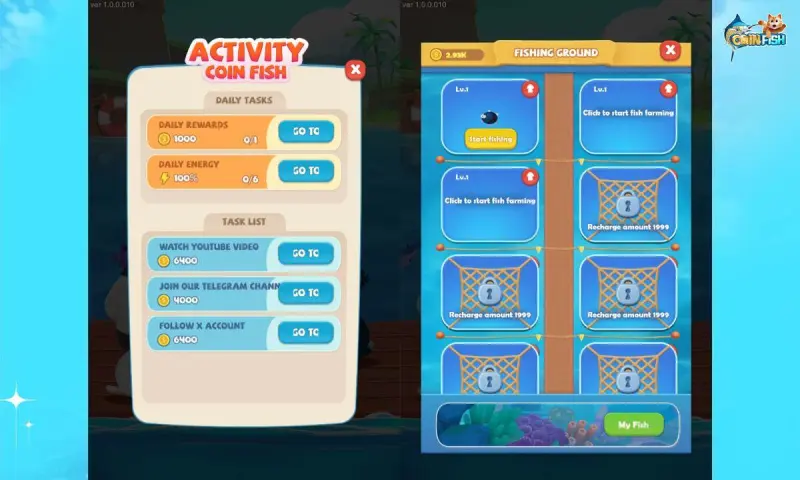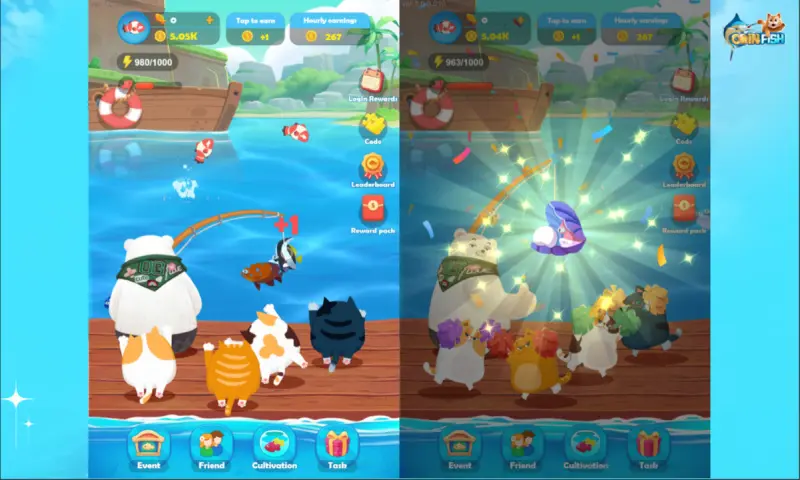 The game features of COINFISH (https://t.me/CoinfishBot) include a parallel combination of fishing and simulation management modes. Players are not required to be online continuously to fish; they can increase the “hourly profit” parameter through fish market simulation management. The game has a referral system and diverse gameplay, with daily activities and task systems to simplify the gaming process, allowing players to earn daily rewards and engage in beneficial interactions with friends. Players can also invite friends to join the game and earn in-game cash rewards. Additionally, players can create their own cat-raising circle, invite friends to jointly care for virtual cats, share Bonus rewards, enhancing the social aspect and engagement of the game.