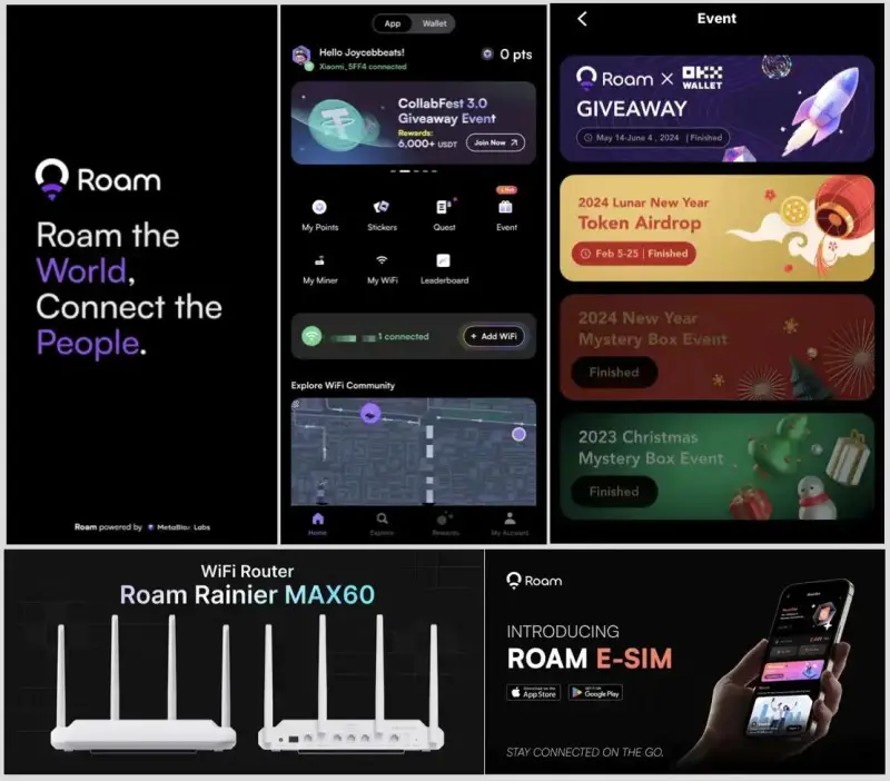 Roam’s hardware and software solutions complement its decentralized network. One notable product is the Roam Rainier MAX60, a WiFi router integrated with blockchain mining capabilities. Users can earn Roam Points, convertible into Roam tokens, by maintaining active devices. Roam also offers an eSIM solution, providing international connectivity without the need for physical SIM cards, thereby enhancing global data access.